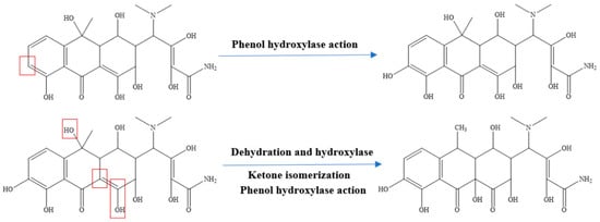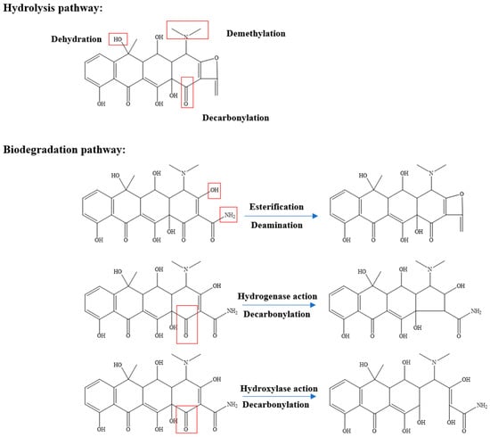 In the microbial method, tetracycline antibiotics are decomposed into small molecular substances via the action of microorganisms []. The activated-sludge method is a representative example of a method involving the microbial degradation of tetracycline antibiotics. It uses microorganisms, mainly bacterial micelles, to adsorb and degrade antibiotics, and this method is characterized by high adsorption and low degradation []. Liu et al. [] used a method that involved adding exogenous surfactant and in-situ biosurfactant to cultivate microorganisms that could be used to remove tetracycline antibiotics. The method converts antibiotics instead of absorbing them and thus significantly reduces the toxicity of antibiotics. M.de Cazes et al. [] successfully removed tetracycline antibiotics in an aqueous solution by immobilizing laccase at room temperature, with results showing good reactivity and stability. The use of a membrane bioreactor improves the reaction rate of activated sludge, reduces the amount of excess sludge, and results in good treatment of tetracycline antibiotic wastewater. However, membrane pollution and high energy consumption have always been the aspects of membrane bioreactors that need to be improved. Microbial degradation is the most widely used method for the removal of antibiotics, but the molecular mechanism of microbial decomposition and transformation of tetracycline antibiotics under different nutritional conditions is still unclear [,,]. Shao et al. [] proposed one route for the biotransformation of tetracycline (removal of methyl, carbonyl, and amine groups). Qi [] proposed that the degradation paths of oxytetracycline are hydrolysis and biodegradation, respectively. Through dehydration, demethylation, decarbonylation, esterification, deamination, enol ketone isomerization, and enzymatic activity, oxytetracycline is degraded; the degradation process is shown in Figure 3.