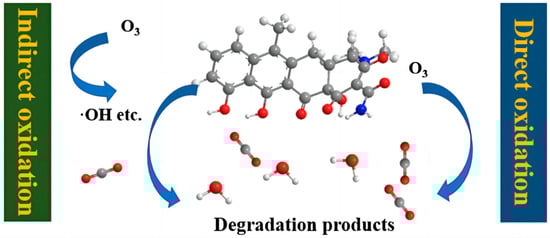 The ozonation method produces strong oxidizing free radicals (such as ·OH, etc.) through indirect oxidation reactions between ozone molecules and antibiotics or via decomposition reactions in water that can be used to mineralize them [,]. O3 has a strong oxidizing ability and can form carboxylic acids with tetracycline antibiotics, thus improving the biodegradability of wastewater []. The mechanism by which ozone oxidation can be used to degrade tetracycline antibiotics is shown in Figure 4.