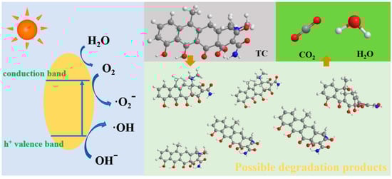 In the photocatalytic method, under specific light conditions, the catalyst generates electron–hole pairs, which react with H2O and other molecules to generate ·OH, which oxidizes and decomposes tetracycline antibiotics and mineralizes them [,]. The ·OH acts on the double bond, keto group, amino group, and keto-enol group of tetracycline antibiotics, and the mechanism is shown in Figure 5.