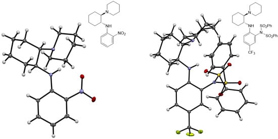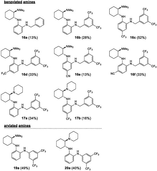 Starting from the chiral benzene-1,2-diamines 6 and 7, four subclasses of noncovalent bifunctional organocatalysts were prepared based on the type of functionalization of the aromatic primary amino group, i.e., the formation of sulfonamides, amides, alkylated amines and arylated amines (Scheme 2, Figure 2 and Figure 3). Sulfonamides 9 and 10 were prepared in 15–65% yield from amines 6 and 7, respectively, and benzenesulfonyl chloride (8a) and 3,5-bis(trifluoromethyl)benzenesulfonyl chloride (8b) in the presence of pyridine. The reactions of amines 7 were carried out at −20 °C with a substoichiometric amount of benzenesulfonyl chloride (8a) (0.9 equiv.) to minimize the formation of double sulfonamides, such as compound 10b′ (isolated in 25% yield), which was formed as a by-product in the sulfonation of amine 7b. Amidation of amines 6 and 7 was carried out either with benzoyl chloride (11) in the presence of DMAP (4-dimethylaminopyridine) and Et3N or with EDCI-activated carboxylic acid (3,5-bis(trifluoromethyl)benzoic acid (12a) and (1S)-(+)-ketopinic acid (12b) were used) to produce amides 13 and 14, respectively, in 23–82% yields. The reductive benzylation of amines 6 and 7 was carried out with benzaldehyde (15a) and 3,5-bis(trifluoromethyl)benzaldehyde (15b) using NaCNBH3 as a reducing agent in the presence of acetic acid or sodium hydrogencarbonate. The corresponding benzylated secondary amines 16 and 17 were formed in yields of 13–52%. Finally, the Buchwald–Hartwig arylation of amines 6 and 7 with 1-bromo-3,5-bis(trifluoromethyl)benzene (18) catalyzed by Pd was carried out using Pd2(dba)3 and BINAP (2,2′-bis(diphenylphosphino)-1,1′-binaphthyl) in the presence of Cs2CO3 in anhydrous degassed toluene according to the procedure in [40]. Compounds 19a and 20a were isolated in 49% and 40% yield, respectively (Scheme 2, Figure 2 and Figure 3). All experimental data and procedures can be found in the Supporting Information.