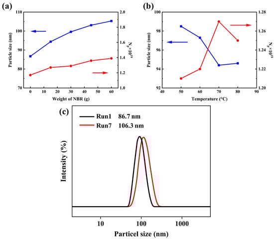 The effect curves of the NBR weight (a) and temperature (b) on particle size and Np; (c) particle size and particle size distributions of Run 1 (VPR) and Run 7 (VPR/NBR).