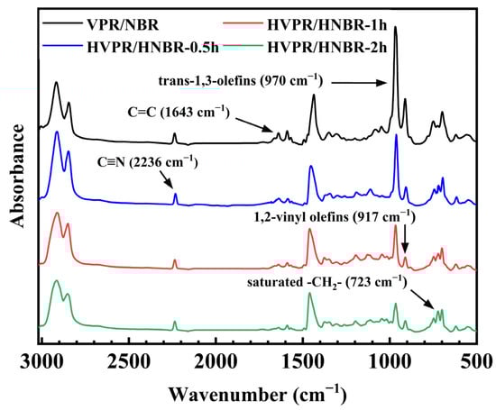 FT–IR spectra of VPR/NBR (black line), HVPR/HNBR–0.5 h (blue line), HVPR/HNBR–1 h (red line), and HVPR/HNBR–2 h (green line).