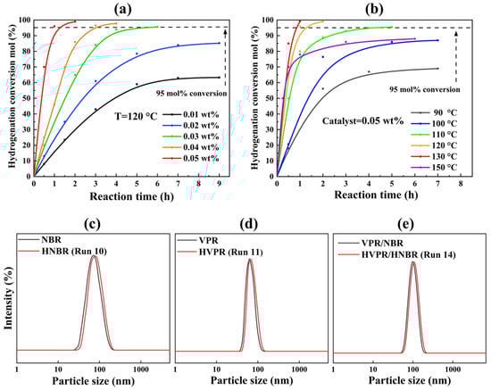 The effect curves of different catalyst amounts (a) and temperature (b) on the hydrogenation degree of the VPR/NBR latex; particle size distribution of NBR (c), VPR (d), and VPR/NBR (e) before and after hydrogenation for 2 h.