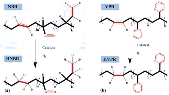 The catalytic hydrogenation process of NBR (a) and VPR (b).
