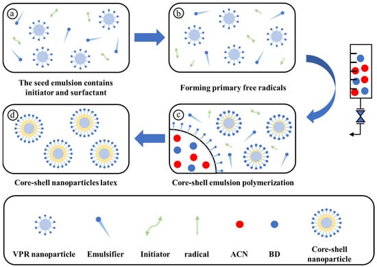 VPR (solid content = 41.25%) was purchased from LANXESS (Pittsburgh, PA, USA). Acrylonitrile (ACN, 99%), methyl ethyl ketone (MEK, reagent grade), ethanol (reagent grade), and acetone (reagent grade) were all purchased from Aladdin Reagent (Shanghai, China) Co., Ltd. Ammonium persulfate (APS, 98%), tert-dodecylmercaptan (t-DDM, 99%), N,N-diethylhydroxylamine (DEHA, 98%), and sodium dodecyl sulfate (SDS, 99%) were purchased from Sigma-Aldrich (St. Louis, MO, USA). Nitrogen (N2, 99.99%), and 1,3-butadiene (BD, 99%) was purchased from Qingdao Ludong Gas Co., Ltd., Qingdao, China.