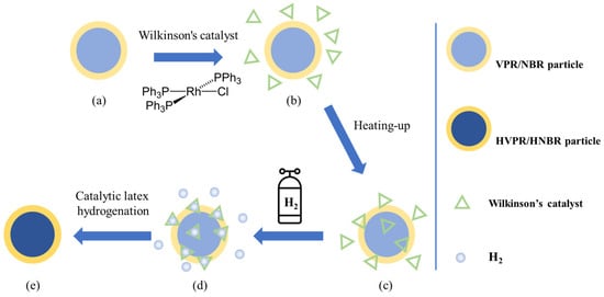 Schematic diagram of the catalytic latex hydrogenation of VPR/NBR polymer nanoparticles.