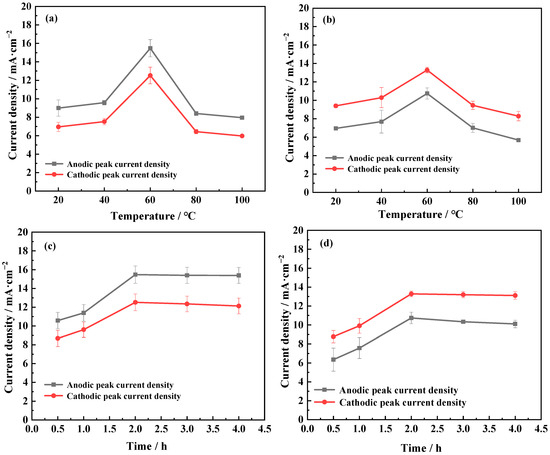 Peak current density at functionalized CNTs: (a) VO2+/VO2+ redox reactions at different treatment temperatures, (b) V2+/V3+ redox reactions at different treatment temperatures, (c) VO2+/VO2+ at different treatment times, and (d) V2+/V3+ redox reactions at different treatment times.