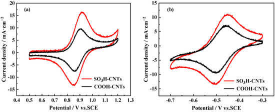 Cyclic voltammetry plots were obtained using an electrolyte solution containing 0.1 M VOSO4 + 2 M H2SO4 for (a) COOH-CNTs and (b) SO3H-CNTs at scan rate from 10 to 50 mV∙s−1; (c) peak current density as a functional of the square root of the scan rate.
