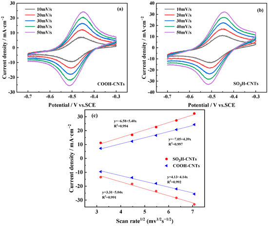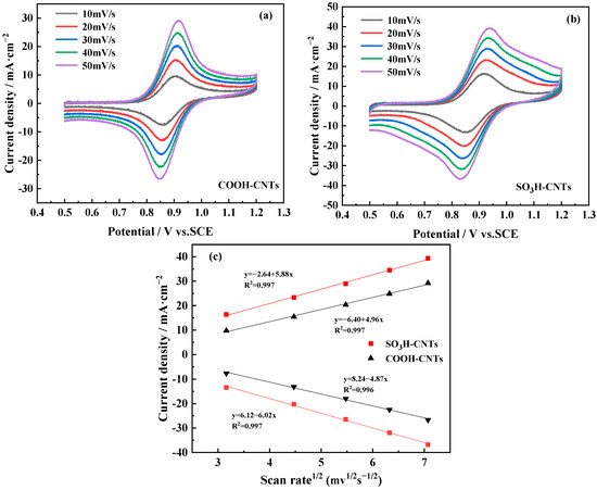 Cyclic voltammetry plots were obtained using an electrolyte solution containing 0.1 M V3+ + 2 M H2SO4 for (a) COOH-CNTs and (b) SO3H-CNTs at scan rate from 10 to 50 mV∙s−1; (c) peak current density as a functional of the square root of the scan rate.