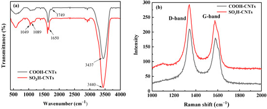 (a) The infrared spectrum of COOH-CNTs and SO3H-CNTs; (b) Raman spectrum of COOH-CNTs and SO3H-CNTs.