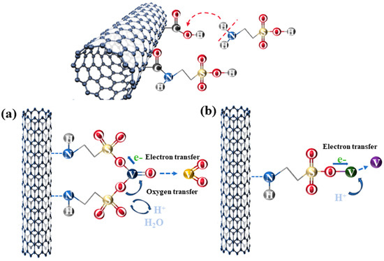 The discussion pertains to the electrocatalytic mechanism of the sulfonic acid group that is developed on the CNT catalysts for facilitating redox reactions involving VO2+/VO2+ and V3+/V2+. This analysis is based on the existing literature [42] and experimental results. This is illustrated in Figure 7. The procedure of charging and discharging comprises a series of discrete stages. Initially, an ion exchange mechanism takes place, wherein vanadium ions within the electrolyte migrate to the electrode surface and establish coordination bonds with the sulfonic acid groups present on the surface of CNTs. Subsequently, an electron transfer process occurs, facilitated by the S-O-V bond, enabling efficient electron transport. Finally, vanadium ions resulting from oxidation or reduction reactions detach from the electrode surface due to their coordination with sulfonic acid groups and diffuse back into the electrolyte. Taurine plays a crucial role as a facilitator in the mass transfer mechanism and as a mediator in the charge transfer process during the electrode reaction, accelerating the electrode reaction rate of vanadium ions. The hydrogen atom in the sulfonic acid group dissociates more readily than the -COOH group due to the pronounced electron-withdrawing influence exerted by the two oxygen atoms on the sulfur atom within the sulfonic acid group. Consequently, vanadium ions exhibit a stronger attraction towards the S-O bond in comparison to the C-O bond, leading to an acceleration in the redox reaction rate.