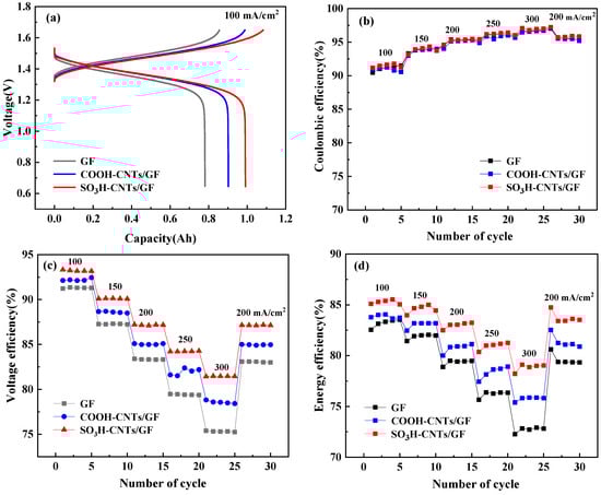To analyze thoroughly the impact of sulfonated CNTs on the performance of batteries, experiments were conducted to assess the charge and discharge capabilities under varying current densities. The efficiency was assessed across five cycles at various current densities between 100 and 300 mA∙cm−2. Subsequently, the current density was reset to 200 mA∙cm−2. Figure 8b illustrates that the coulombic efficiency of the VRFB remains consistent across the different current densities. However, there are significant differences in their voltage efficiency and energy efficiency, as shown in Figure 8c and Figure 8d, respectively. The battery utilizing SO3H-CNTs/GF as electrodes shows improved voltage efficiency and energy efficiency in comparison to those with untreated GF electrodes. At a current density of 300 mA∙cm−2, the voltage efficiency and energy efficiency values for the battery using GF as the electrode are 75.31% and 72.71%, respectively. The voltage efficiency and energy efficiency of cells using COOH-CNTs/GF electrodes are 78.58% and 75.76%, respectively. The voltage efficiency and energy efficiency of batteries using SO3H-CNTs/GF as electrodes are 81.46% and 78.83%, respectively. In comparison to cells with standard GF electrodes, the improvements are 6.15% and 6.12%, respectively. This trend aligns with the catalytic activity pattern exhibited by the electrodes. The addition of sulfonic acid groups to electrode surfaces increases active sites, improving the electrochemical activity of graphite felts and reducing electrochemical polarization during high-current-density electrode reactions. This indicates that SO3H-CNTs positively affect the electrochemical performance.