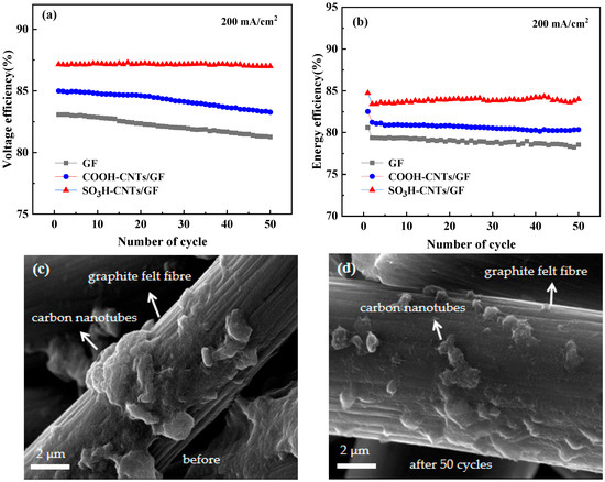 To investigate the impact of SO3H-CNTs catalyst on the operational stability and robustness of the VRFB, a 50-cycle charge–discharge experiment was conducted at a current density of 200 mA∙cm−2. The outcomes are depicted in Figure 9a,b, indicating that the voltage and energy efficiencies of the three cells exhibit a relatively stable performance over 50 cycles. The average voltage efficiency of the battery using conventional GF is 81.75%, with an energy efficiency of 78.71%. The average voltage efficiency and energy efficiency of batteries using COOH-CNTs/GF are 83.85% and 80.42%, respectively. The average voltage efficiency and energy efficiency of batteries using SO3H-CNTs/GF are 87.12% and 83.95%, respectively, showing an increase of 5.37% and 5.24% compared to conventional cells. This phenomenon is attributed to the use of SO3H-CNTs as catalysts, which improves the electrochemical activity by facilitating mass transfer and reducing the activation energy of the reaction. Even when exposed to highly acidic electrolyte conditions (3 M H2SO4), SO3H-CNTs maintained their catalytic activity over a prolonged period. Figure 9c,d show scanning electron micrographs of graphite felt coated with SO3H-CNTs. In Figure 9c, the successful adhesion of CNTs to the surface of the graphite felt is evident. In Figure 9d, it is clear that even after 50 cycles, a portion of CNTs remain firmly attached to the graphite felt.