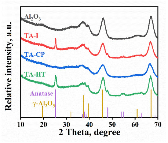 The XRD patterns of the TiO2-Al2O3 together with the Al2O3 supports were recorded, and the results are shown in Figure 1. As Figure 1 shows, all samples exhibited the diffraction peaks of γ-Al2O3 (2θ of about 36°, 45°, and 67°) (JCPDS card No. 10-0425). In addition, the diffraction peaks at about 25°, 48°, 54°, and 55° for the TA-I and TA-HT samples are identified as anatase (JCPDS card No. 21-1272). For TA-I, when the amount of the titania exceeded the largest capacity of the monolayer distribution on Al2O3, TiO2 existed in the form of anatase by aggregation. The presence of XRD patterns of anatase indicates poor dispersion of TiO2 in TiO2-Al2O3 synthesized via the impregnation method, which is consistent with the results in the literature [18]. As shown in Figure 1, TA-CP did not show any anatase diffraction peaks; this result implied that the Ti atoms entered and were well dispersed in the Al2O3 skeleton during the co-precipitation process. However, after hydrothermal treatment, the Ti atoms dispersed in Al2O3 aggregated through hydroxyl linkage and showed anatase diffraction peaks. The XRD results for all TiO2-containing supports demonstrated that the introduction of TiO2 affects the intensity of the diffraction peaks of γ-Al2O3, indicating that the alumina particle size and crystallinity were changed.