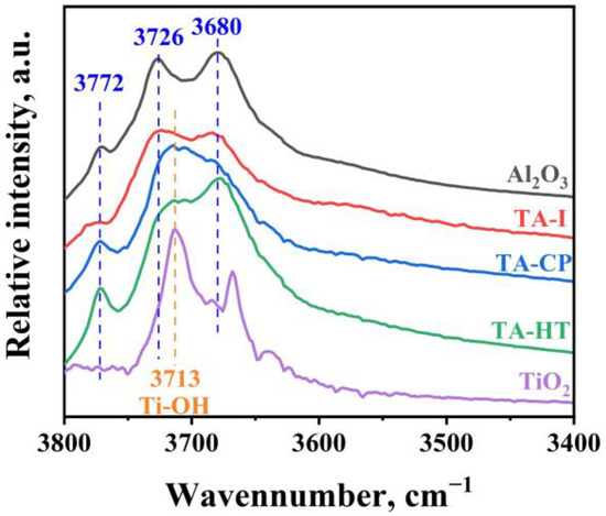 Given that the nature and amount of surface hydroxyl groups determine the dispersion of the metal species [31], we used IR spectroscopy to characterize the distribution of hydroxyl groups in the prepared supports, as illustrated in Figure 4. Generally, basic, neutral, and acidic hydroxyl groups were identified with the bands located around 3772, 3726, and 3680 cm−1, respectively [32]. Furthermore, for TiO2-Al2O3 supports, the band centered around 3720 cm−1 can be regarded as the Ti-OH group [33].