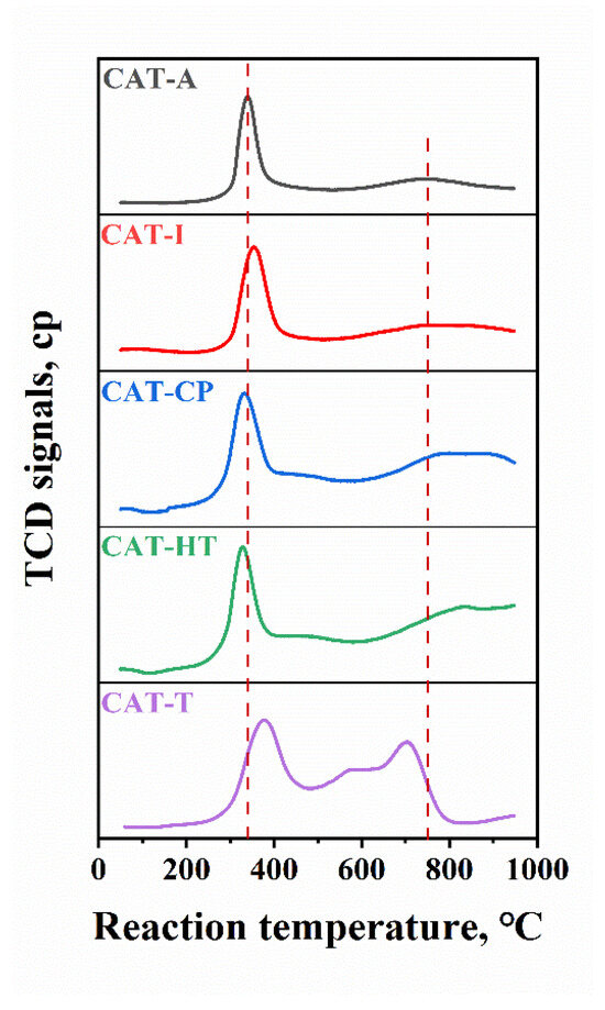 To further examine the effect of anatase incorporation in alumina on MSI, H2-TPR characterization was employed, and the obtained profiles are exhibited in Figure 7. There are mainly three peaks: The peak located at around 300~400 °C is attributed to the reduction from Mo6+ to Mo4+, and the peak centered at approximately 500 °C is assigned to the reduction of the Mo6+ species that strongly interacted with the TiO2 to the lower coordinated species. The high-temperature reduction peak centered at around 800 °C is attributed to the reduction from Mo4+ to Mo0 [8]. Besides that, the higher temperature peak between the 542 °C and 812 °C interval of CAT-T is also partly attributed to the reduction of the support material itself [42,43].
