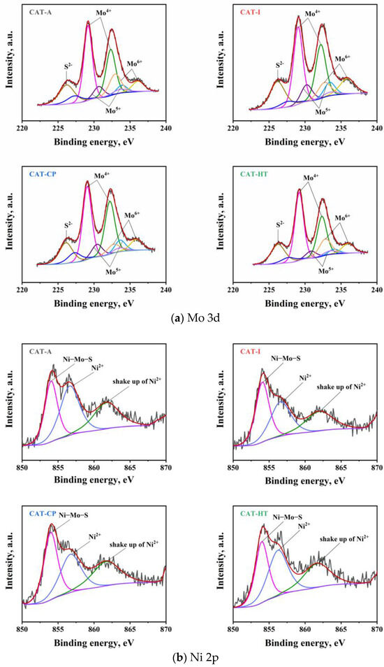 X-ray photoelectron spectroscopy (XPS) was used to evaluate the effect of Ti species on the covalent states and sulfidation degrees of the active metals in the sulfided catalysts. Moreover, the deconvolution results according to the literature method [44,45,46] are shown in Figure 9a, and the calculated results are shown in Table 3. As observed in Figure 9a, the area of Mo5+ and Mo6+ peaks of CAT-CP and CAT-HT decreased notably, indicating that the sulfidation degree of Mo (Mosulfidation) was enhanced compared with CAT-A. On the contrary, the Mo5+ and Mo6+ peak areas of CAT-I increased relative to CAT-A, which can be explained by the results of H2-TPR, where the low-temperature reduction peaks of CAT-CP and CAT-HT were shifted to a lower temperature. This feature makes it easier to reduce Mo6+ to Mo4+ during the sulfidation process. The reduction of Mo6+ to Mo4+ is difficult in CAT-I, and the sulfation degree of Mo is relatively lower. The calculated results are summarized in Table 3, and the Mosulfidation increases according to the order of CAT-I < CAT-A < CAT-HT < CAT-CP.