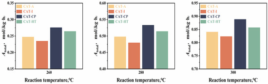 In accordance with the above characterization results and analysis, it can be determined that the different forms of Ti elements in alumina will have different effects on the properties of the catalysts. To further analyze the influence of Ti elements on catalytic performance, 4,6-DMDBT was selected as the probe molecule, and the HDS test results over the sulfided catalysts at temperatures ranging from 260 °C to 300 °C are displayed in Figure 10. As Figure 10 shows, the total HDS activity (Atotal) over the sulfided catalysts increased with increasing reaction temperatures. In addition, the Atotal increases in a sequence of CAT-I < CAT-A < CAT-HT < CAT-CP at all investigated reaction temperatures.