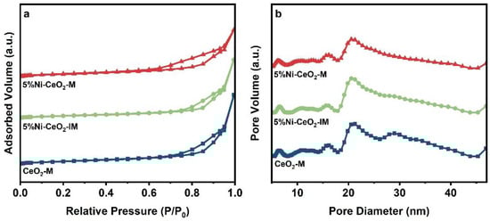 (a) N2 adsorption–desorption isotherms and (b) pore size distributions of CeO2-M, 5%Ni-CeO2-IM, and 5%Ni-CeO2-M catalysts.