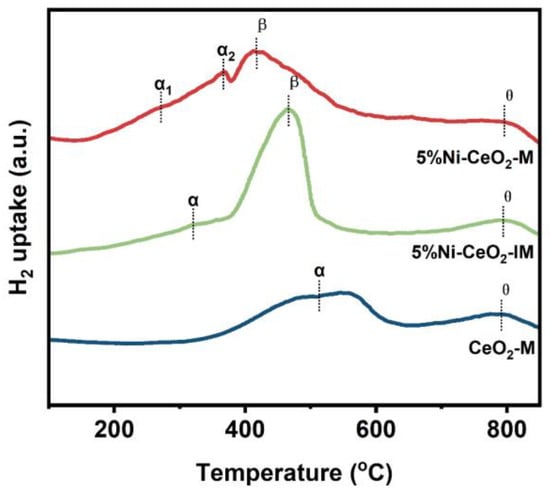 H2-TPR profiles of fresh CeO2, 5%Ni-CeO2-M, and 5%Ni-CeO2-IM catalysts.