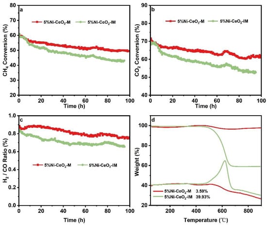 The quantity of carbon deposited on the spent catalysts was quantified using TG, and the results are shown in Figure 6d. The oxidization of deposited carbon was the source of the notable weight loss (39.9%) of the 5%Ni-CeO2-IM catalyst between 500 and 700 °C. In contrast, after 100 h of performance testing, the 5%Ni-CeO2-M catalyst contributed only 3.6% of the weight decrease. This indicated that the 5%Ni-CeO2-M catalyst demonstrated strong resistance to carbon deposition.