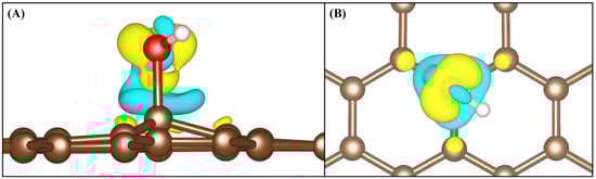 (A) side, and (B) top views of charge density differences caused by the adsorption of OH on GO. The blue and yellow iso-surfaces indicate charge depletion and accumulation, with the iso-surface value set to ±0.01. Carbon, oxygen, and hydrogen atoms are shown in gray, red, and white, respectively.