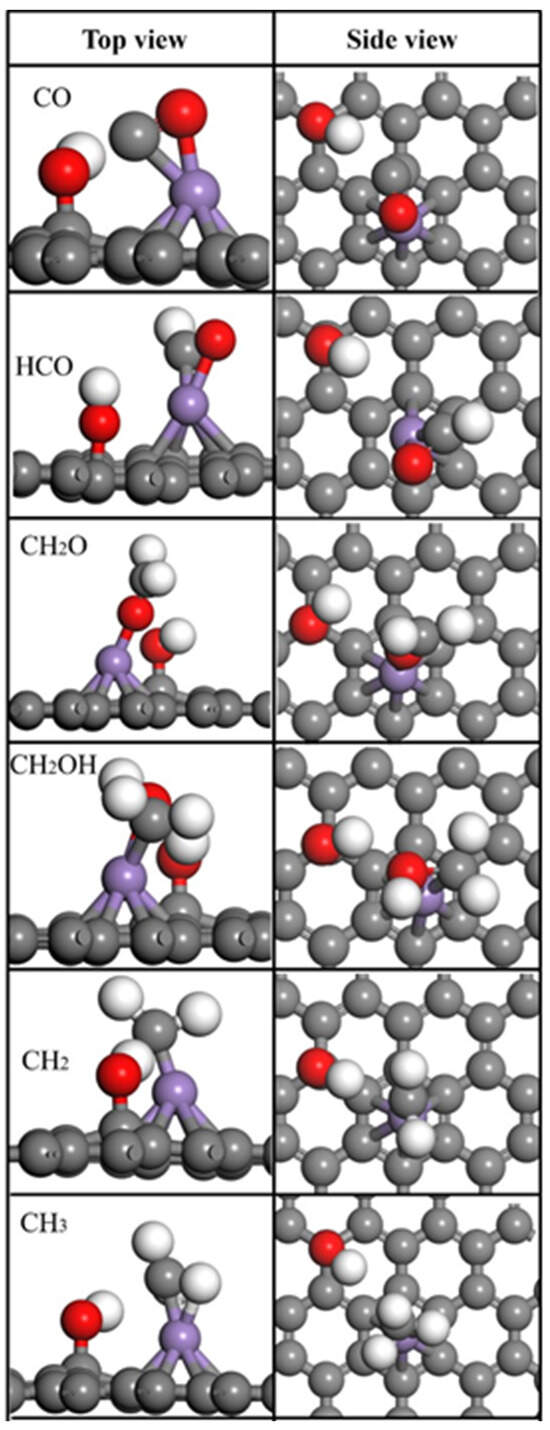 Adsorption geometries of the studied molecules during CO hydrogenation on Mn-doped GO surface. The gray, white, red, and purple balls represent carbon, hydrogen, oxygen, and manganese atoms, respectively.