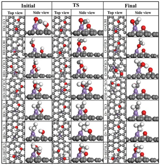 In the Fischer–Tropsch reaction, both CH4 and CH3OH products undergo similar reactions but lead to distinct outcomes, and CO, acting as the reactant, gives rise to both products. Hence, the molecules were positioned in close proximity to the metal catalyst (Mn) on the surface. This strategic placement is essential for facilitating the relevant reactions that lead to the formation of CH4 and CH3OH. In this study, we propose a reaction pathway where hydrogen from the hydroxyl group of the GO transfers to the intermediates and the remaining oxygen from the hydroxyl group adsorbs on the carbon surface atoms as an epoxy group, as seen in other experimental and theoretical studies [55,56,57]. We employ a model proposed for the conversion of carbon monoxide to methane and methanol on a Mn-doped GO surface to simulate the likely route of carbon monoxide reduction, as shown in Table 1, where we have focused on the fundamental CO + OH → HCO + O reaction [55]. For both methane and methanol formation, we suggest a comparable scheme where the initial, second, and third stages of hydrogenation are identical to minimize the number of reactions to reach the products (Table 1). Our proposed mechanism does not include the CO hydrogenation to COH reaction, due to the instability of COH on Mn-doped GO. Moreover, we have not considered the CO dissociation reaction, as we aimed to minimize the pathway by solely focusing on the hydrogenation of CO without disrupting its bond, in alignment with previous studies on GO catalysts [54,55].