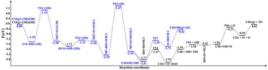 Table 3 presents the calculated reaction energies of the investigated reactions. Due to the low reaction energy (0.05 eV), the interaction of CO with OH to produce HCO and O is relatively easy to achieve. The conversion of CO to HCO, a precursor to longer-chain hydrocarbons, is initiated through this reaction, whereas the reaction between HCO and OH, resulting in CH2O and O with a reaction energy of 0.41 eV, is more endothermic.