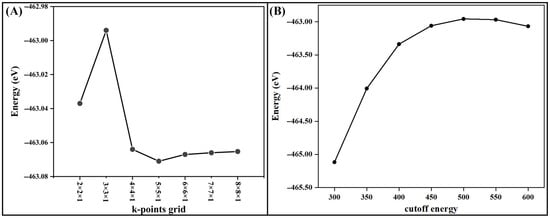 During geometry optimization, we sampled the Brillouin zone using a 6 × 6 × 1 special k-points grid, following the Monkhorst–Pack scheme [89,90]. The electron wave functions were expanded using plane waves with a cutoff energy of 450 eV for the graphene oxide structures. Geometry optimization ceased once the total energy converged within 10−5 eV, and the force exerted on each ion fell below 0.01 eV/Å. Figure 6 shows that the energy is converged at a k-points grid and cutoff energy of 6 × 6 × 1 and 450 eV, respectively.