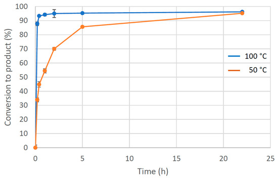 Formation of 10-methoxybenzo[h]quinoline from benzo[h]quinoline over time using 1.1 mol% Pd(OAc)2 in the presence of PhI(OAc)2 in MeOH at 100 °C (blue line) and 50 °C (orange line). Conversion was determined from an average of three independent experiments by comparing the integration of H-2 and H-10 resonances in benzo[h]quinoline with the diagnostic methoxy resonance in the 10-methoxybenzo[h]quinoline product.