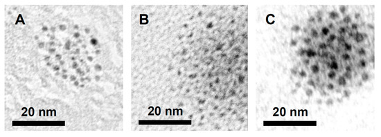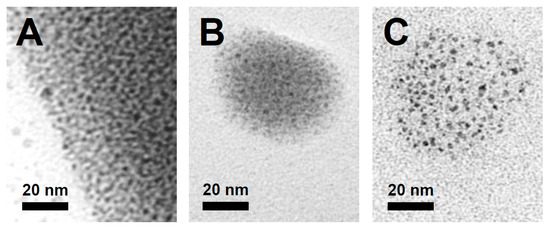 TEM images of Pd nanoparticles formed after heating benzo[h]quinoline and PhI(OAc)2 with 1 at 100 °C for 2 h in the presence of (A) MeOH, (B) EtOH, and (C) iPrOH (and acetic acid).