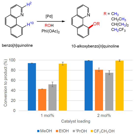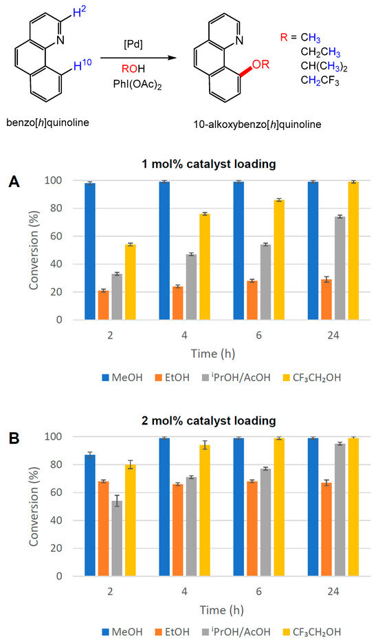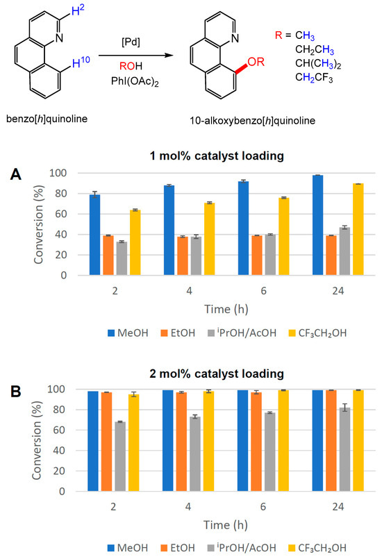 Alkoxy functionalisation of benzo[h]quinoline in different alcohol solvents at 50 °C employing PdI2(dppf) (2) as a catalyst at (A) 1 mol% and (B) 2 mol% [Pd] loading. The conversion to 10-alkoxybenzo[h]quinoline was determined by 1H NMR spectroscopy using the average of three independent experiments by comparing the integration of H-2 and H-10 resonances in benzo[h]quinoline with the diagnostic resonances of methoxy, ethoxy, isopropoxy and trifluoroethoxy groups in the products.