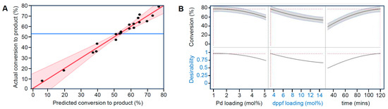 (A) Predicted and actual conversion to the desired product for the DoE model and (B) predicted optimal conditions (1 mol% 2, 3 mol% dppf, 120 min) for the benchmark reaction between p-bromobiphenyl and p-toluidine at 100 °C in CPME solution, as extracted from definitive screening design variable profiles.