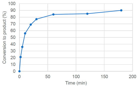 Reaction profile for the reaction between p-bromobiphenyl and p-toluidine at 100 °C in CPME in the presence of 1 mol% PdI2(dppf) (2) and 3 mol% dppf. The conversion to the desired amination product was determined by 1H NMR spectroscopy by comparing the integration of diagnostic methyl resonances in the product with an internal standard, 1,3,5-trimethoxybenzene. Values are the average of three independent experiments.