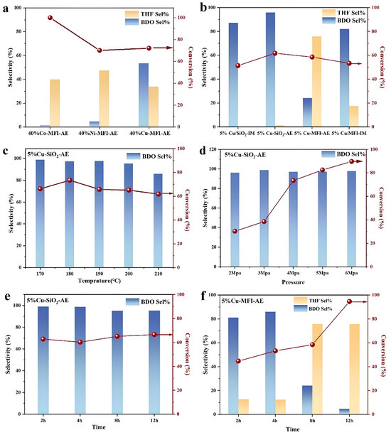 (a) Catalytic performance of GBL hydrogenation over various base metal catalysts (T = 200 °C, 4 MPa H2, 8 h); (b) results of GBL hydrogenation over different Cu catalysts (T = 200 °C, 4 MPa H2, 8 h); performance of 5%Cu-SiO2-AE catalyst for GBL hydrogenation at (c) different temperatures (4 MPa H2, 8 h) and (d) H2 pressures (T = 200 °C, 8 h); (e) performance of 5%Cu-SiO2-AE catalyst for GBL hydrogenation at different times (T = 200 °C, 4 MPa H2); (f) performance of 5%Cu-MFI-AE catalyst for GBL hydrogenation at different times (T = 200 °C, 4 MPa H2).