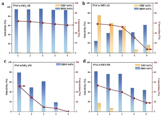The stability of Cu catalysts under different preparation methods and silicious supports was compared in cyclic reactions. As depicted in Figure 2, the BDO selectivity over the 5%Cu-SiO2-AE catalyst leveled off above 90% in five cycle operations, with the GBL conversion just slightly decreasing from the initial 61.7 to 53.2%. In contrast to the stable and high performance of 5%Cu-SiO2-AE, the IM method-produced 5%Cu/SiO2-IM catalyst exhibited negligible activity after several consecutive runs. This is in line with a previous report that showed that the AE method enhances the interaction between Cu species and silicious supports, which stabilizes the metal nanoparticles in the reaction [34]. In addition, poor activity stability was also observed in the MFI-supported catalysts, as shown in Figure 2b,d, demonstrating that the support property had a more significant effect on the catalyst stability. In our previous study, Cu-MFI-AE catalysts were robust in ethanol dehydrogenation [34]. However, in the present study, the 5%Cu-SiO2-AE catalyst was the notably better one, indicating that the silicious support derived from a silica sol is an attractive candidate for the synthesis of a high performance catalyst.