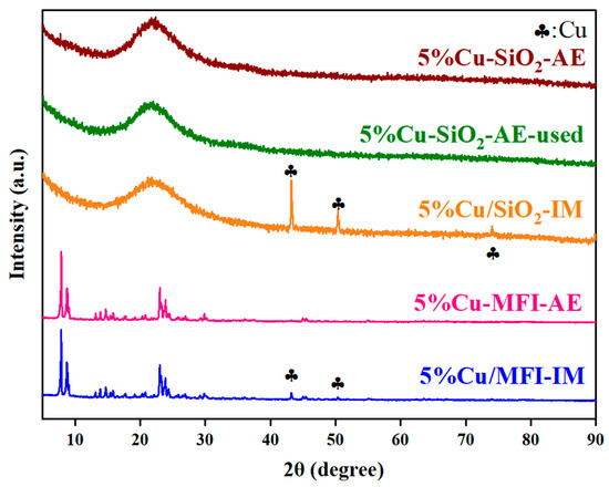 The X-ray diffraction (XRD) patterns of various reduced Cu catalysts are displayed in Figure 3. The typical peaks owing to the crystallite nature of MFI zeolite were clearly observed in the XRD patterns of the MFI-supported Cu catalysts, demonstrating that zeolite was synthesized successfully and that its structure was retained well after loading Cu on it. As for the diffraction peaks of metallic Cu, they were observed on the patterns of the Cu/MFI-IM and Cu/SiO2-IM catalysts, but absent for those prepared by the AE method. This suggests the latter two catalysts contained more uniformly dispersed copper species [35,36]. For the spent 5%Cu-SiO2-AE catalyst (after five times running), no sign of bulk metallic Cu particles was observed. This demonstrates that the copper species on the 5%Cu-SiO2-AE catalyst are stable and not apt to sinter during the reaction, possibly owing to the enhanced interaction between Cu and the silicious supports in the AE process [34,37].