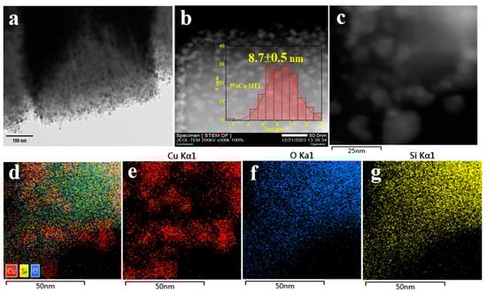 TEM image (a), HAADF-STEM images (b,c), and element mapping images (d–g) of 5%Cu-MFI-AE catalyst.