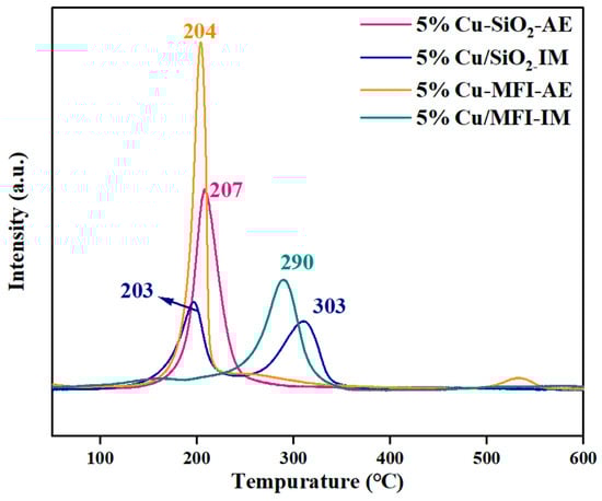 H2-TPR experiments were conducted to probe the state of Cu species on the various catalysts before reduction. As illustrated in Figure 6, a sharp H2 consumption peak was observed at 204 °C for the 5%Cu-SiO2-AE catalyst, which was attributed to the highly dispersed Cu species on the silicious support [34,38,39,40]. The 5%Cu-MFI-AE catalyst presented a similar reduction peak at 207°, but with a wider scope of temperature than that of the 5%Cu-SiO2-AE counterpart. This indicates that the Cu species distribution on the 5%Cu-MFI-AE catalyst was less uniform than that over the 5%Cu-SiO2-AE catalyst [41,42], consistent with the HAADF-STEM observation. As for the reduction behaviors of the Cu/MFI-IM and Cu/SiO2-IM catalysts, H2 consumption peaks at notably higher temperatures (ca. 300 °C) were observed. This indicates that bulk CuO particles were present in the catalyst precursors [43,44,45], which formed large size metallic Cu particles after reduction, as evidenced by the XRD analysis.