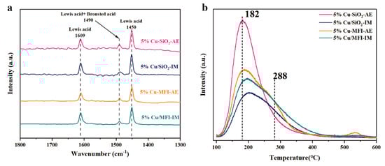 Pyridine-FTIR experiments were conducted to measure the nature of the acid sites over the catalysts. As displayed in Figure 7a, bands at 1450 and 1609 cm−1, owing to Lewis acid sites (LAS), were observed over the Cu catalysts [46,47,48]. The strength of catalyst acidity was probed by NH3-TPD-MS measurements and the results are displayed in Figure 7b. NH3 desorption occurred in the range of 100–400 °C for all of the Cu catalysts, indexed to the weak and medium-strong acid sites [49,50]. Among the various catalysts, 5%Cu-SiO2-AE showed the lowest amount of medium-strong acid sites, according to its NH3 desorption peak area at 288 °C [51]. The amounts of medium-strong acid sites follow an order of 5%Cu-MFI-AE > 5%Cu/MFI > 5Cu/SiO2 > 5%Cu-SiO2-AE, which is well in line with the trend of THF selectivity observed over the four catalysts. Therefore, the strong acidity of catalysts facilitates the dehydration of BDO to form THF.