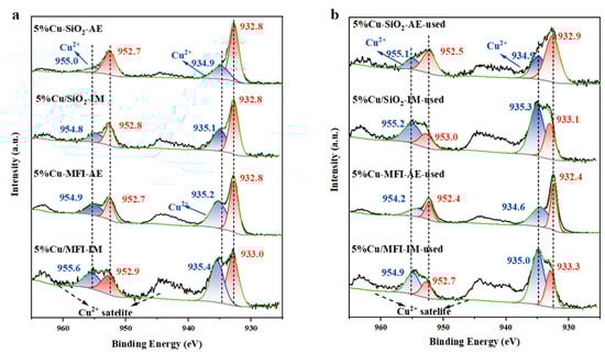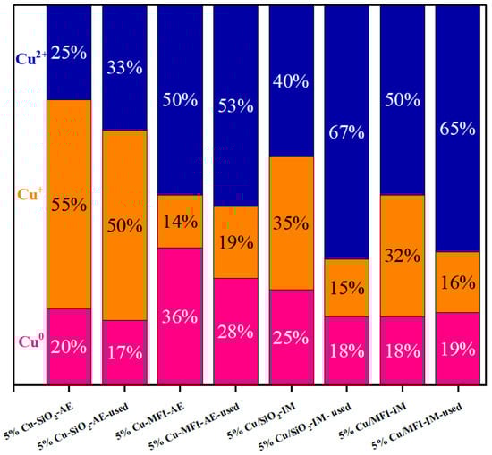 It has been reported that the chemical state of metal species affects hydrogenation activity. Therefore, XPS analysis was employed to identify the valance state of the Cu species on the catalysts (Figure 8). The different Cu species were distinguished and quantified by deconvoluting the XPS peaks. The signals at 932.8 and 952.7 eV were assigned to the Cu 2p1/2 and 2p3/2 of the reduced Cu species (Cu0 and/or Cu+), respectively, which were observed over all the Cu catalysts [52,53]. The XAES of Cu LMM analysis provided quantified information regarding the Cu+ (913.7 eV) and Cu0 (916.9 eV) species composition (Figures S12 and S13) according to the integral areas [41,52,54]. The relative contents of the Cu species in various valences are displayed in Figure 9. Over the fresh 5%Cu-SiO2-AE catalyst, 20% of Cu was completely reduced to the metallic state and remained in the catalyst, along with 55% oxidic Cu+ and 25% oxidic Cu2+. After five repeated cycles, the composition of Cu in different valences did not notably change, manifesting the high stability of the 5%Cu-SiO2-AE catalyst in the reactions. Similar stability in the Cu species composition was also observed on the 5%Cu-MFI-AE catalyst after five cycles of operation. Again, this shows that the active Cu species on the catalysts prepared by the AE method were relatively stable. On the contrary, the valence of the Cu species in the Cu catalysts prepared by the IM method changed significantly after cyclic reactions, with a notable increase in the Cu2+ content and a decrease in the Cu+ content. Thus, the instability of the Cu species over the catalysts may partially account for the deactivation of IM method-prepared Cu catalysts in cyclic reactions.