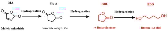 The catalytic hydrogenation of maleic anhydride to BDO (MATB) is a sustainable process, as the reactant can be obtained from the conversion of biomass platform compounds like butanol, furfural, and lignin [11,12,13,14,15]. The MATB process largely includes three reaction steps: maleic anhydride hydrogenation to succinic anhydride, then to γ-butyrolactone (GBL), and the final product of BDO, as depicted in Scheme 1 [16,17,18]. In the past decades, remarkable progress has been achieved in producing BDO from succinic acid. For example, Minh et al. reported that ca. 60% selectivity and yield of BDO from succinic acid were obtained over supported bimetallic 4%Re-2%Pd/C catalysts at 160 °C under a pressure of 150 bar [19,20]. Benoit et al. claimed that the BDO yield was related to the oxidation state of the Re3+ rather than Re0 species over the Re-Pd/TiO2 catalysts. Ki Hyuk et al. reported that the yield of BDO was well correlated with the number of weak hydrogen-binding sites of the Re catalysts [21,22]. Cheaper metals like Cu and Fe have been used to replace noble metals and construct bimetallic M1-M2/C catalysts (where M1 and M2 are base and noble metals, respectively) to realize catalytic conversion of succinic acid to BDO under milder reaction conditions [23,24,25]. For instance, Son et al. reported a 8Cu-2Pd/HAP catalyst, which afforded 82% BDO selectivity after 96 h reaction at 200 °C and 8 MPa H2 [4]. Additionally, there have been reports indicating that Cu-based catalysts can facilitate the synthesis of BDO under light irradiation [26,27,28,29].