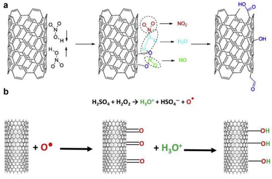 To enhance the adhesion between catalytic nanoparticles and the surface of the structured support and to increase the reactivity of CNTs by creating active sites that facilitate the distribution of catalyst nanoparticles, the support undergoes chemical or physical pre-modification [102,103,104,105,106]. In the case of chemical (or covalent) functionalization, new functional groups are attached to the carbon atoms [107]. Physical groups or atoms are attached through physical sorption [108], or surface defects are created. When functionalizing CNTs, one of the best options is to use a mixture of nitric and sulfuric acids [109]. The mechanism of action of such treatment is shown in Figure 5. This treatment is carried out to form various functional groups on the surface of nanotubes [110], such as carboxyl groups, thiol groups, etc.