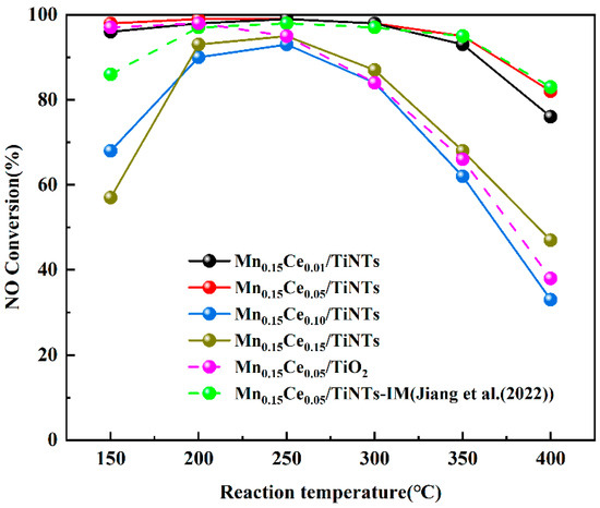 The notations and molar ratios of the synthesized catalysts are listed in Table 1. As shown in Figure 1, the Mn0.15Ce0.05/TiNT catalyst demonstrates the highest ηNO in the entire temperature range of 150–400 °C. Its ηNO reaches above 98% even when the temperature is as low as 150 °C and can be maintained at approximately 95% in a wider temperature range of 150–350 °C. This indicates that TiNTs can significantly improve the SCR activity and broaden the active temperature window of the catalyst. This can be attributed to the larger specific surface area and unique hollow tubular structure of TiNTs. Both of them improve the adsorption capacity of the catalyst and capture more reactant molecules for NH3-SCR reaction. Moreover, TiNTs achieve high dispersion of active components on the inner and outer wall of TiNTs, which enriches the number of active sites on the catalyst surface [20,21]. The above reasons explain the higher catalytic activity of MnCe/TiNTs at low temperatures.