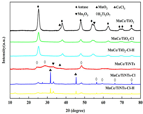According to the XRD patterns in Figure 4, the diffraction peaks corresponding to anatase (PDF#21-1272) rather than rutile TiO2 appear in the MnCe/TiO2 catalyst. The diffraction peaks at 37.1° and 55.1° correspond to the (100) lattice plane of MnO2 (PDF#30-0820) and (440) lattice plane of Mn2O3 (PDF#41-1422), respectively [7]. The peaks belonging to the CeO2 crystal are not detected either due to its low content or the formation of MnCeOx solid solution [12]. As for the MnCe/TiO2-Cl catalyst, the diffraction peaks assigned to MnOx and TiO2 become weakened, mainly because the chlorination of the MnCe/TiO2 catalyst distorts the crystal structures [14]. The diffraction peaks of the MnCe/TiO2-Cl-H catalyst are not further weakened, implying that the addition of H2O barely influences the crystal structure of catalyst.