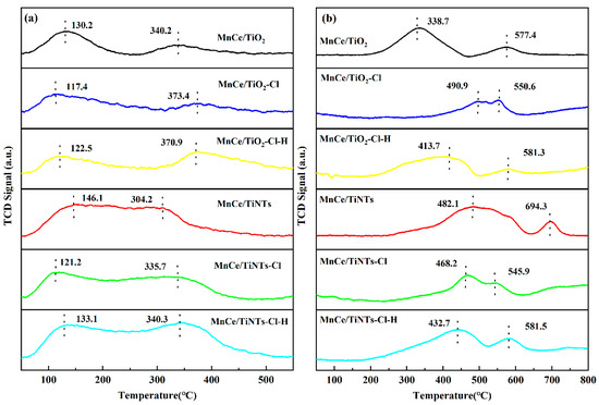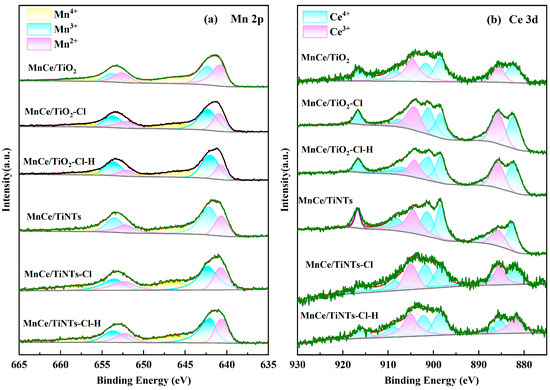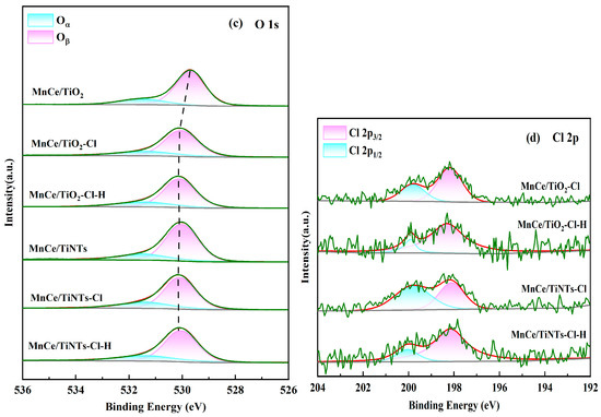 As for the MnCe/TiO2-Cl catalyst, the total area of the reduction peaks decreases and their positions are shifted to higher temperatures significantly more compared to the fresh one. This can be ascribed to the anchor of the chlorine atoms on the surface Ov, which hinders the redox cycle of the catalyst [32,33]. As for the MnCe/TiNTs-Cl catalyst, the positions remain unchanged, and their areas decline slightly. This explains the stronger resistance of the MnCe/TiNT catalyst to HCl. Furthermore, the reduction peaks of the MnCe/TiO2-Cl-H and MnCe/TiNTs-Cl-H catalysts change less. This phenomenon confirms that the chlorination of the surface reactive components can be effectively alleviated in the presence of H2O, especially in the case of the MnCe/TiNT catalyst.