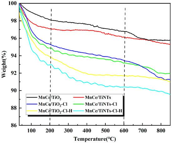 In comparison with the fresh MnCe/TiO2 catalyst, more mass loss is observed below 200 °C and above 600 °C for the MnCe/TiO2-Cl catalyst. The former can be attributed to the desorption of the weakly adsorbed HCl [36]; the latter can be ascribed to the volatilization and decomposition of metal chlorides on the catalyst surface, which is produced from the chlorination of the catalyst [37]. The mass loss of the MnCe/TiNTs-Cl catalyst above 600 °C is clearly lower than that of the MnCe/TiO2-Cl catalyst. This confirms that TiNTs can hinder the chlorination of catalyst induced by HCl. The MnCe/TiO2-Cl-H and MnCe/TiNTs-Cl-H catalysts exhibited significant mass loss below 600 °C, while that above 600 °C was barely observed. This further suggests that the presence of H2O can alleviate the chlorination of catalysts.
