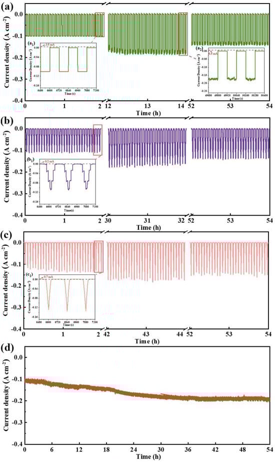 In the following test, the working electrodes were FeNiMo-LDH@NiMo/SS-coated electrodes, which exhibited excellent HER catalytic performance in alkaline electrolyte, as demonstrated in Table 1. The fluctuation amplitudes of square-wave voltage were −1.275~0 V, −1.358~0 V and −1.592~0 V, respectively. These tests were completed for 180 h, and the T-I curves were recorded, as are shown in Figure S8. The current density was positively correlated with the input voltage. The current density results for all power fluctuation amplitudes presented a decreasing behavior during the test time, with larger fluctuations in voltage amplitudes resulting in a more pronounced decrease. The beginning of the test, intermediate point and end of the test T-I curves are enlarged and presented in Figure 6a–d, and the average current density for 6 h periods are given as statistics in Figure 7.