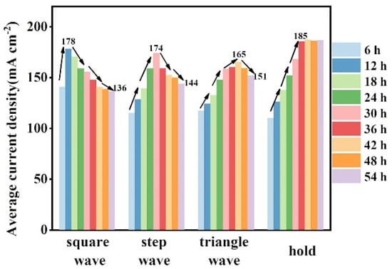In order to investigate the plate Ni cathode’s electrochemical behavior when powered by various forms of fluctuating voltage, time (T)–current density (I) curves were recorded, as shown in Figure S1. The current density was positively correlated with the catalytic performance of the Ni cathode. In comparison with the hold voltage results, the current density showed an increase first and then a decrease in behavior during the test with fluctuating power, which indicated that the surface condition and HER behavior were changed due to the voltage fluctuation. The beginning of test, optimal time and end of test T-I curves are presented in Figure 1a–d, and the average current density (@−1.710 V) at 6 h are given as statistics in Figure 2. The current density was highly responsive to voltage fluctuation, showing the same type of response as that to a change in power input, especially at the beginning of the experiment.